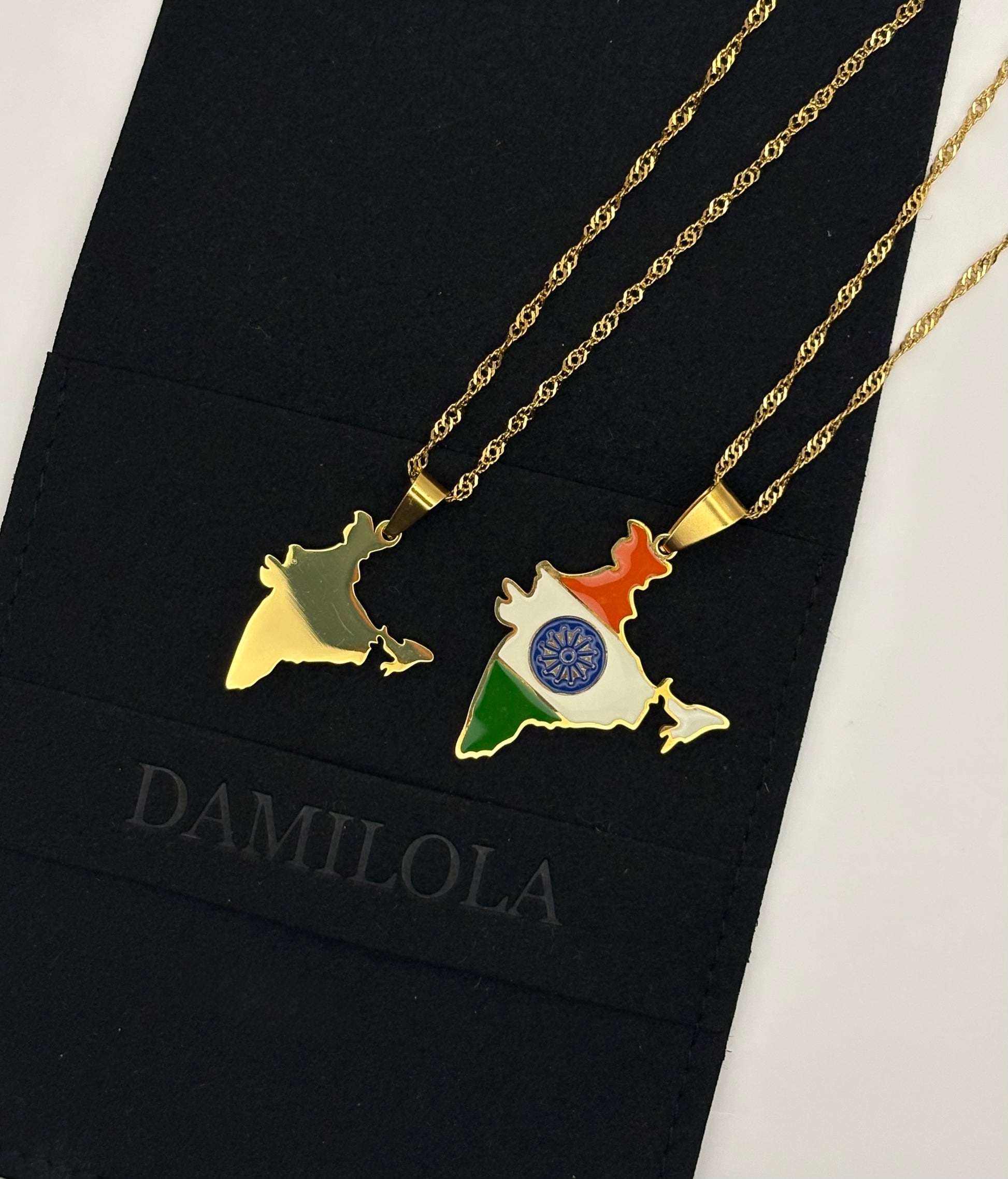 Carry the spirit of India wherever you go. This India Map Necklace comes in two meaningful styles: a sleek all-gold outline for a minimalist everyday look, or a vibrant flag version featuring the colours that represent India’s heart — saffron for courage, white for truth and peace, green for growth, and the Ashoka Chakra symbolising righteousness.