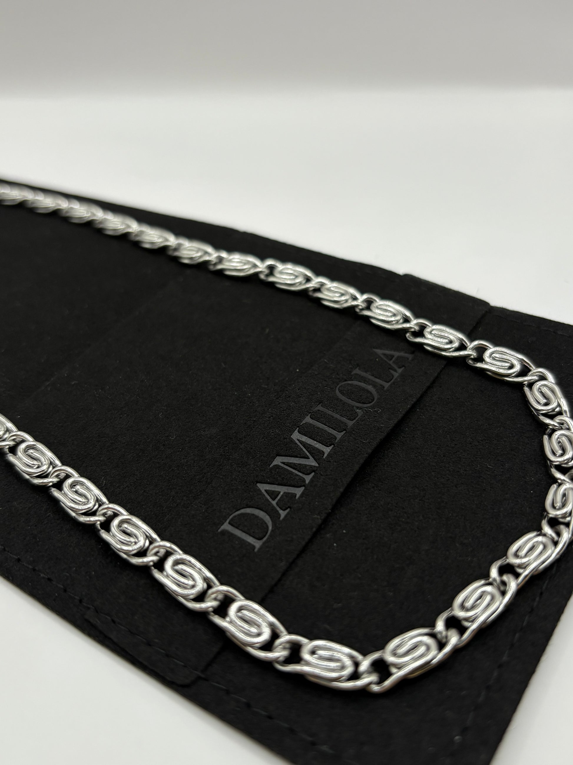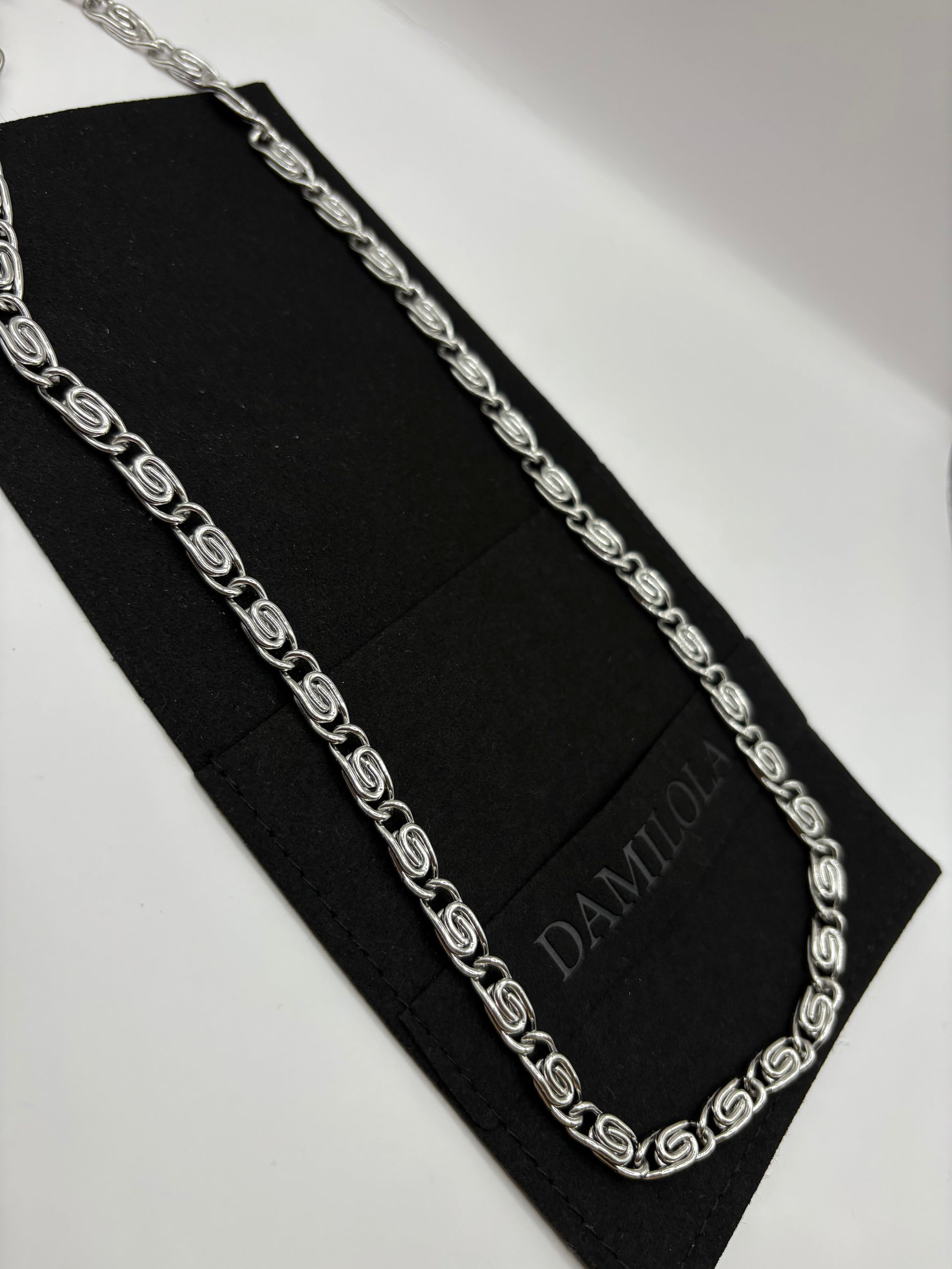 The New Interlocked Chain by Damilola Jewellery is crafted from premium stainless steel, designed to elevate any look with its sleek, sculptural links. Its unique interwoven design reflects movement, connection, and strength — making it a statement piece for every style.